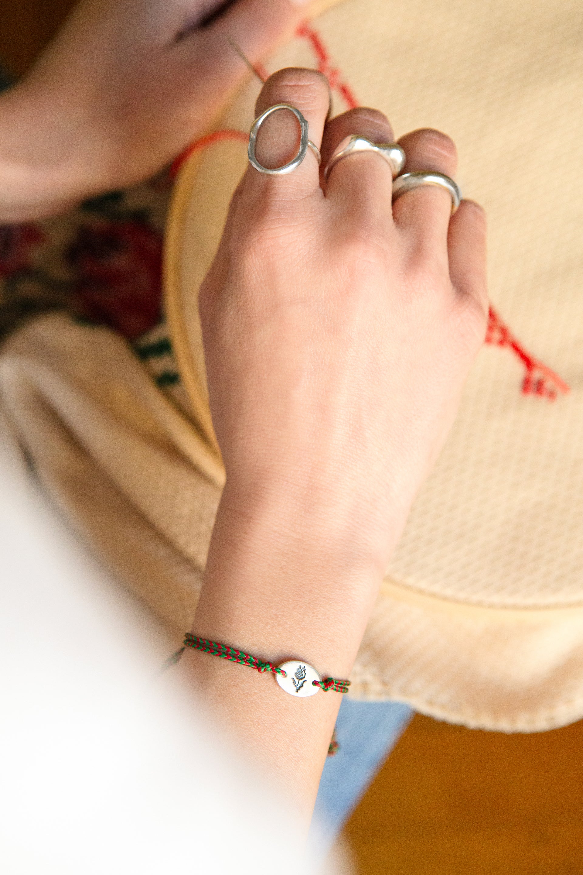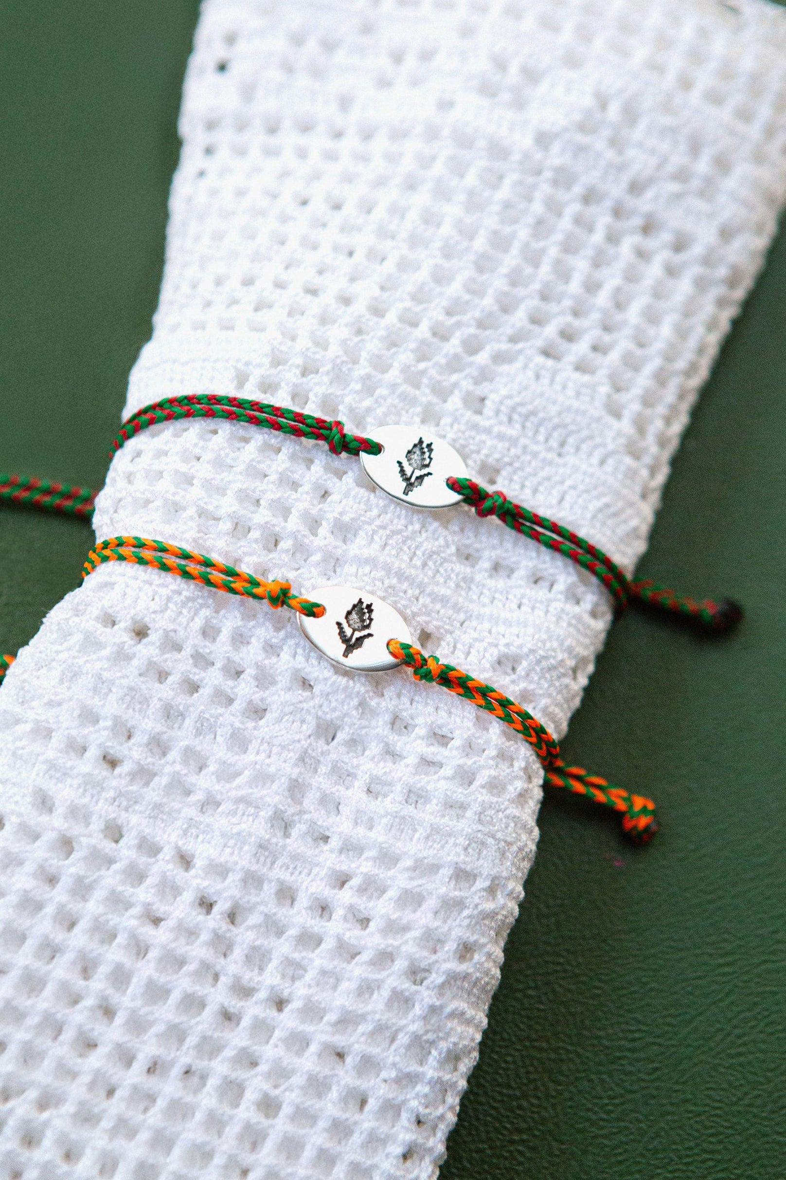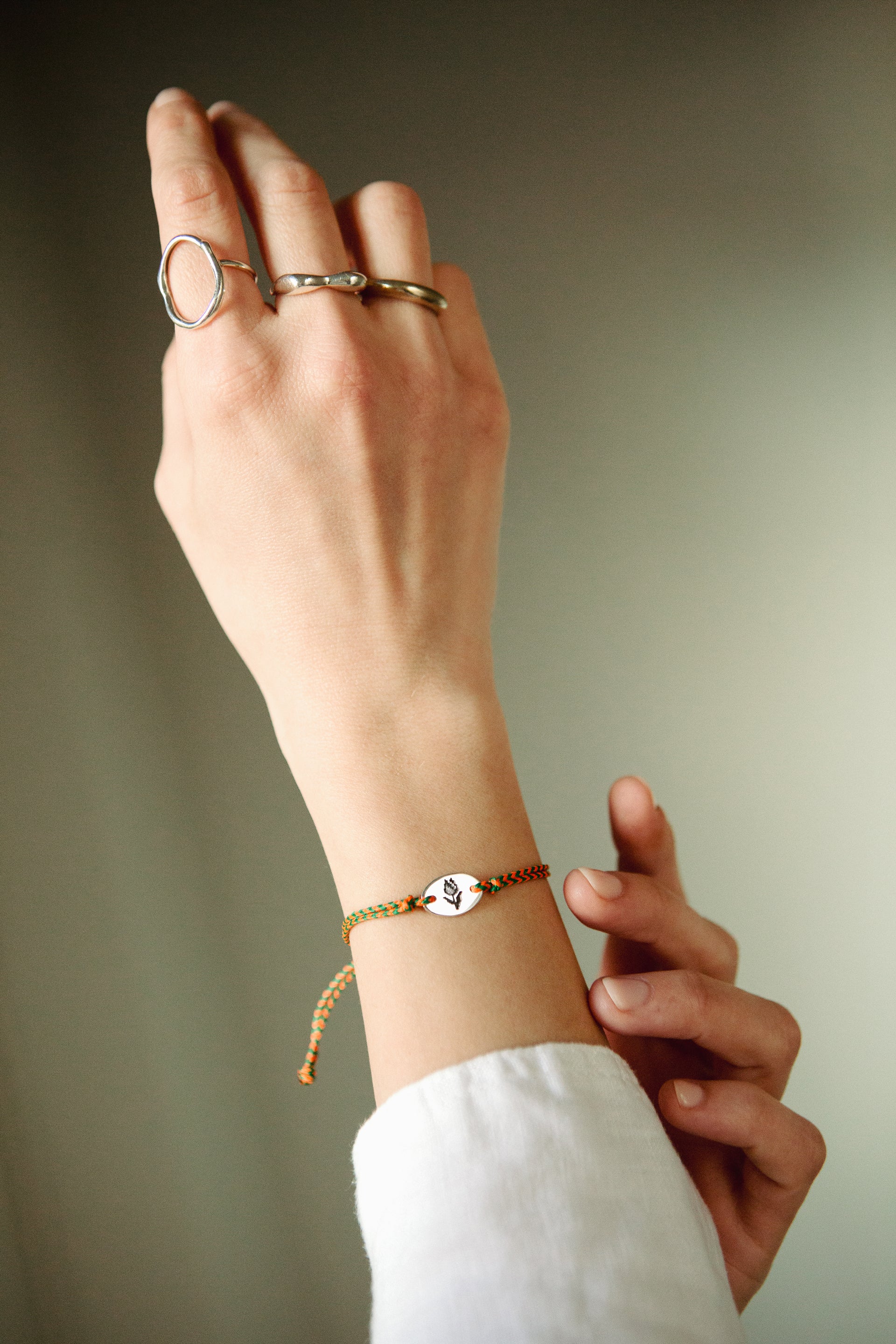Tulip is our modern take on the traditional March bracelet, hand-braided cords paired with a delicate sterling silver charm, engraved with a protective symbol.